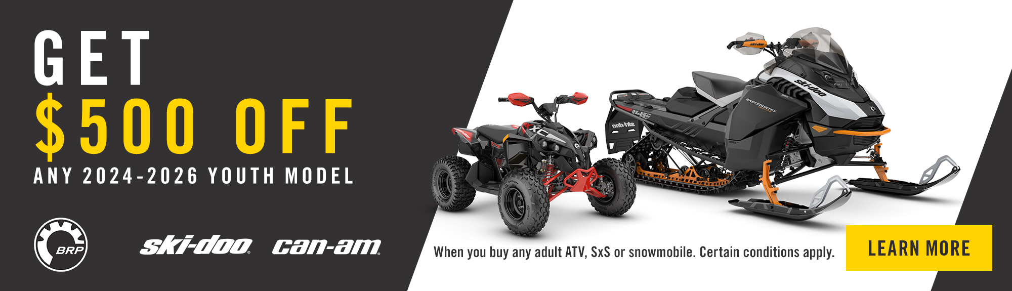 † Get a $500 rebate on eligible models: Consumers who purchase or purchased a new and unused 2024-2026 adult Can-Am ATV, Can-Am SSV, Lynx or Ski-Doo model (excl. NEOs) are eligible to an additional $500 rebate on any 2024-2026 eligible Youth model. Limit of one $500 rebate per transaction and per consumer. The purchase of the adult Can-Am ATV or Can-Am SSV vehicle must take place between July 1st, 2025 and March 31, 2026. The purchase of the adult Lynx or Ski-Doo vehicle must take place between April 1st, 2025 and March 31st, 2026.